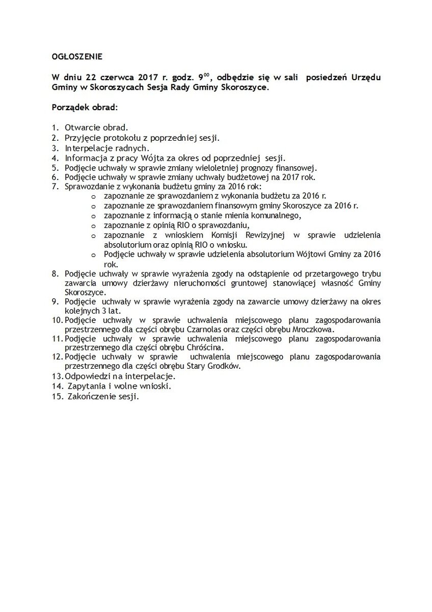 Ogłoszenie w sprawie sesji w dniu 22 czerwca 2017 r.