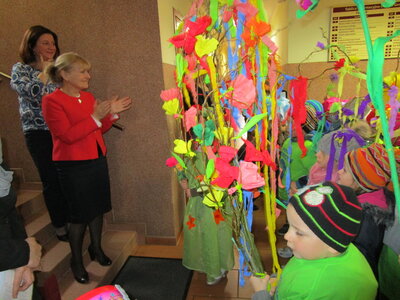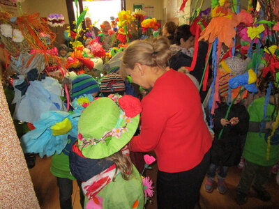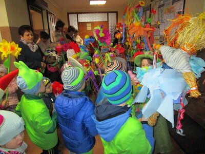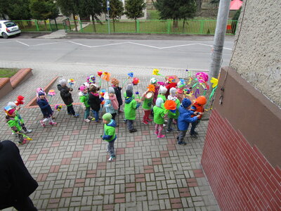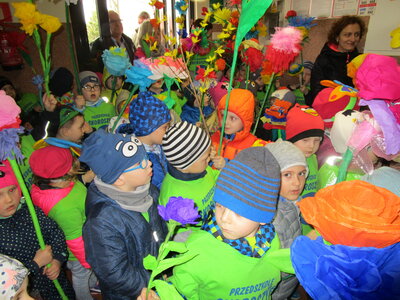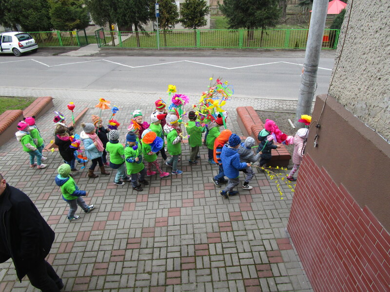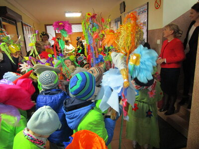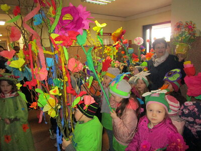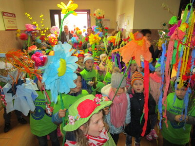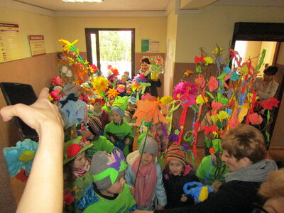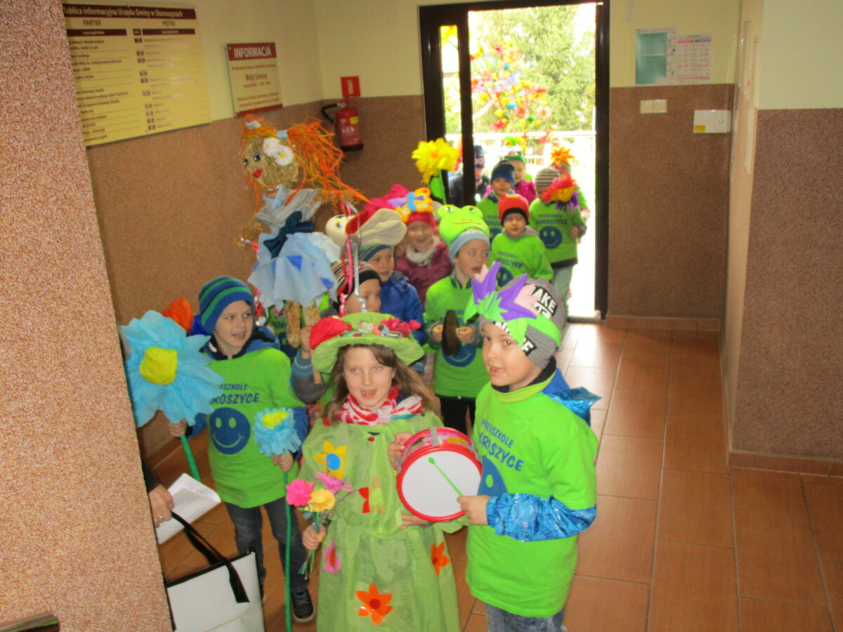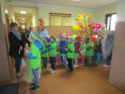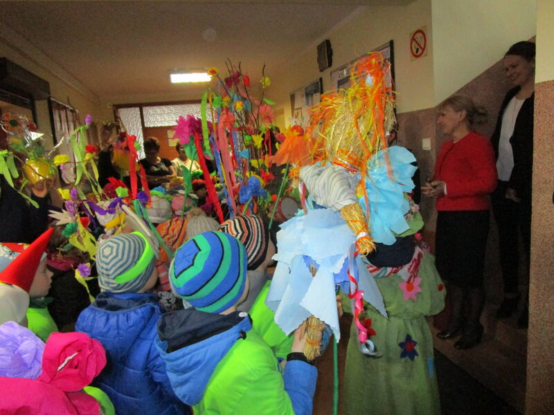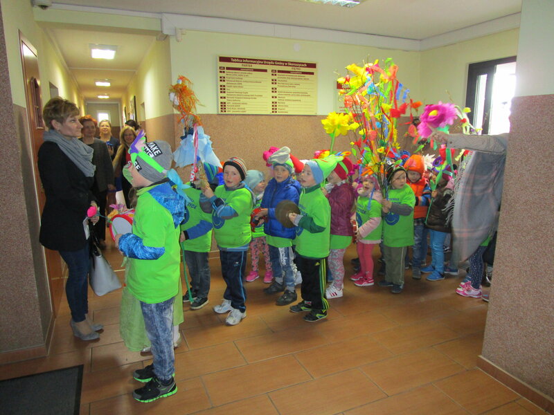 Przedszkolaków wraz z opiekunami powitała Wójt Gminy Skoroszyce Barbara Dybczak. Uśmiechnięte przedszkolaki wiosnę przywitały w sposób wielce artystyczny. W strojach dzieci dominował kolor zielony i żółty, pięknie prezentowały się również kolorowe kwiaty oraz nakrycia głowy - kapelusze i czapeczki bociana i żabki. Dzieci przygotowały wiosenne piosenki i wierszyki. Przy wspólnym śpiewaniu przedszkolaki pożegnały zimę i powitały wiosnę. W podziękowaniu za przybycie Pani Wójt Barbara Dybczak wręczyła przedszkolakom słodycze.