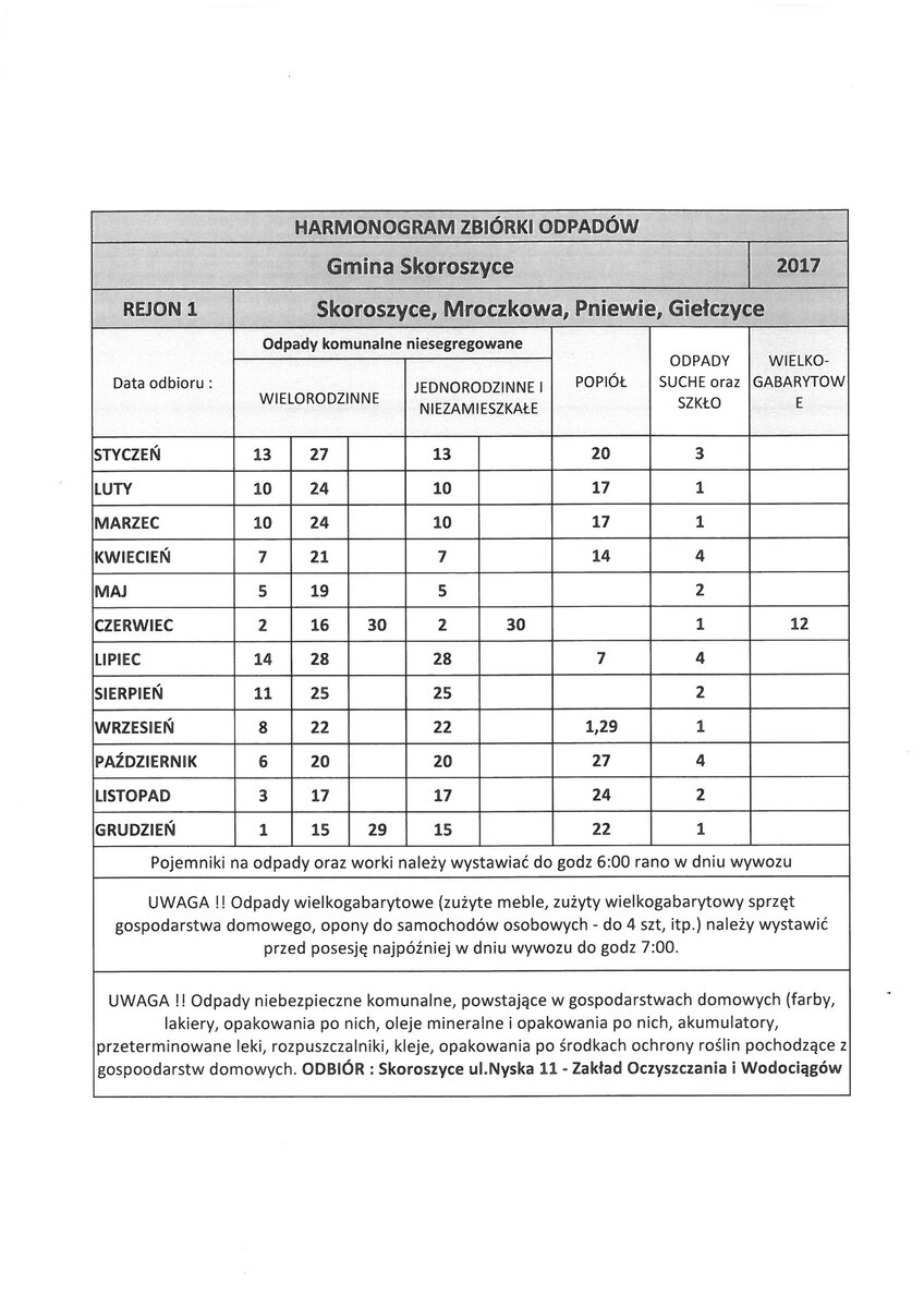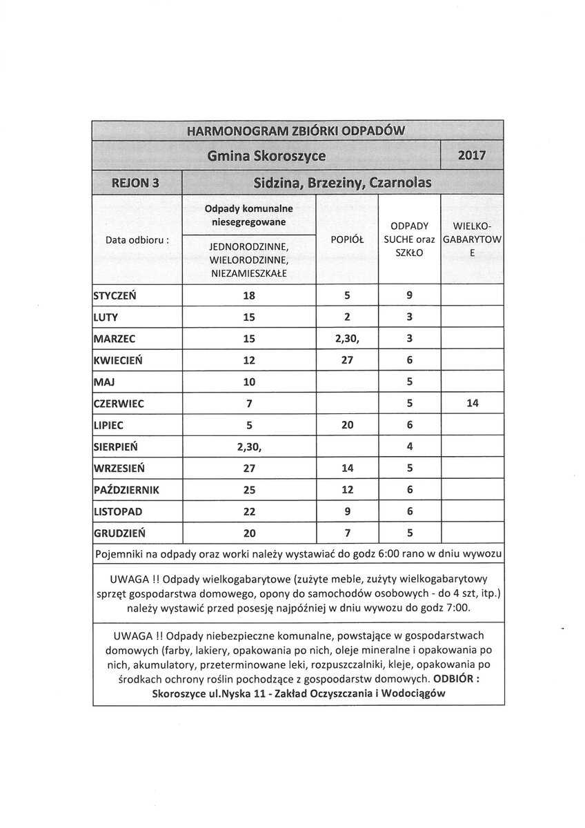 HARMONOGRAM ZBIÓRKI ODPADÓW W 2017 ROKU