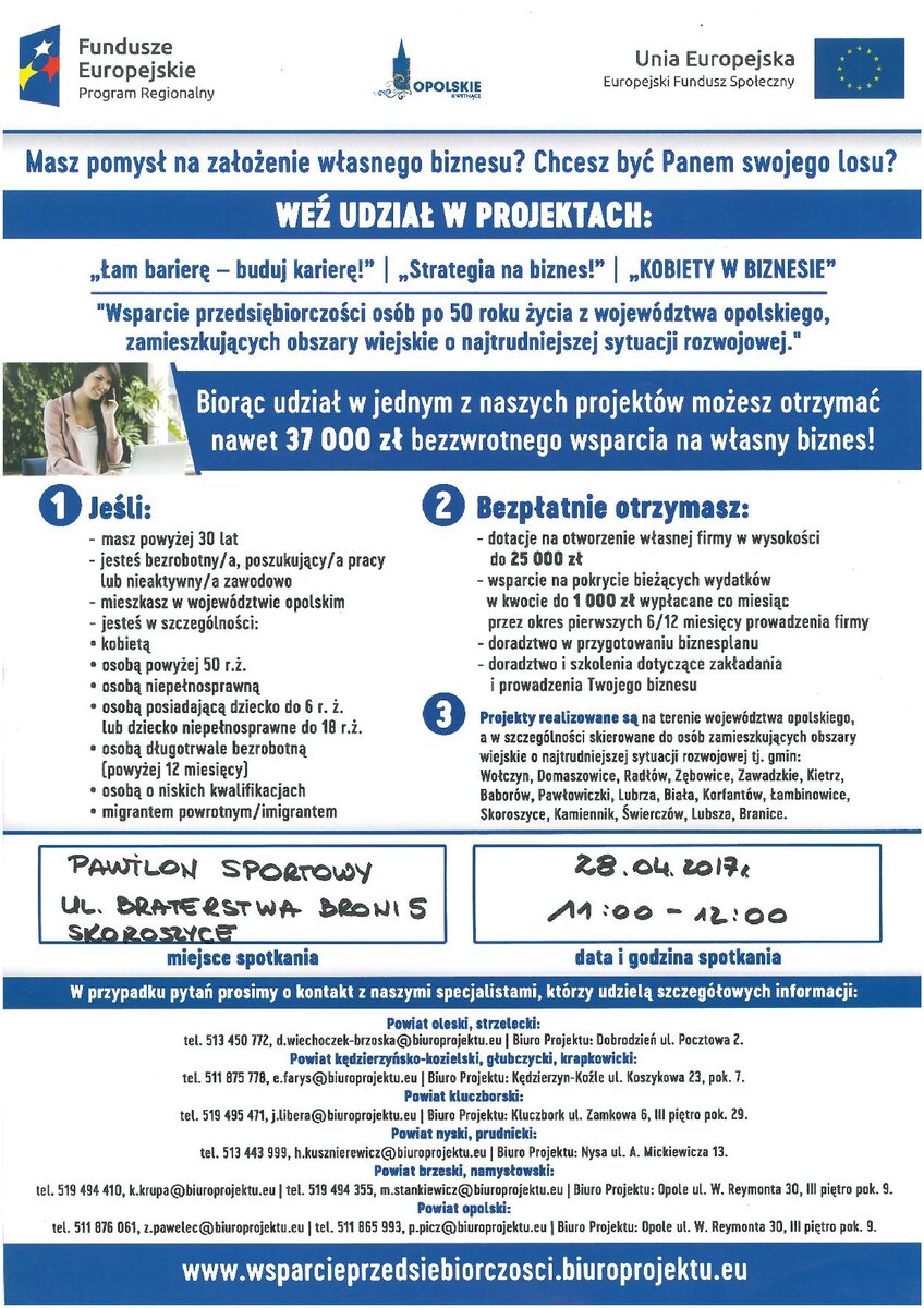 Zachęcamy Mieszkańców Gminy Skoroszyce do udziału w spotkaniu informacyjnym dotyczącym projektów, w ramach których można otrzymać nawet 37 000 zł dotacji na otworzenie własnej firmy. Spotkanie odbędzie się 28.04.2017 r. (piątek ) o godz. 11:00 w Pawilonie Sportowym w Skoroszycach przy ul. Braterstwa Broni 5.