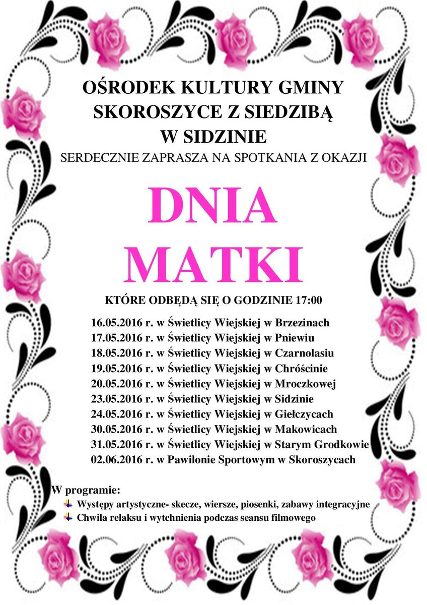 Ośrodek Kultury Gminy Skoroszyce serdecznie zaprasza na spotkania z okazji Dnia Matki