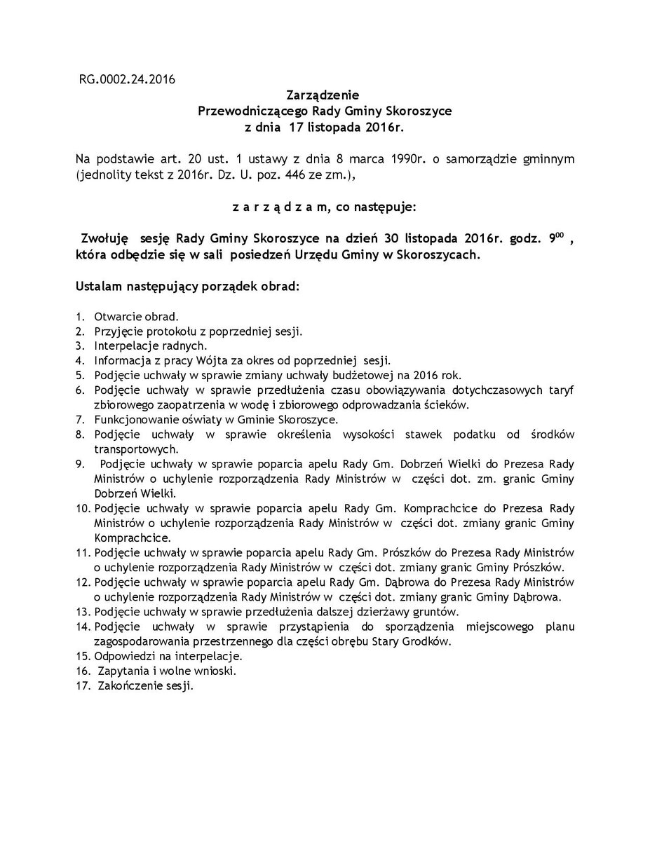 Porządek obrad sesji Rady Gminy Skoroszyce w dniu 30 listopada 2016 r. godz. 9.00 sala posiedzeń Urzędu Gminy w Skoroszycach.