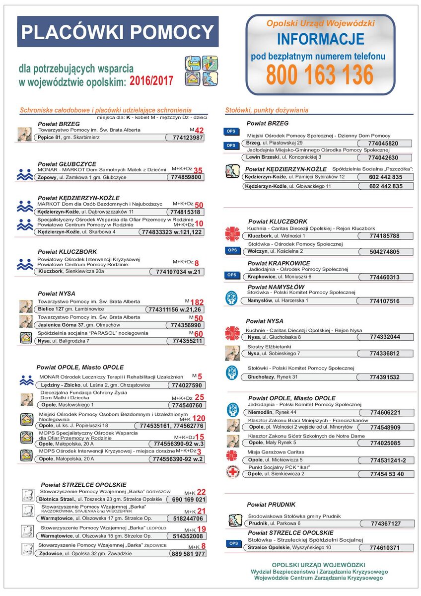 Informacje dla potrzebujących wsparcia w województwie opolskim (schroniska, punkty dożywiania) w czasie zimy 2016/2017 w załączonym pliku.