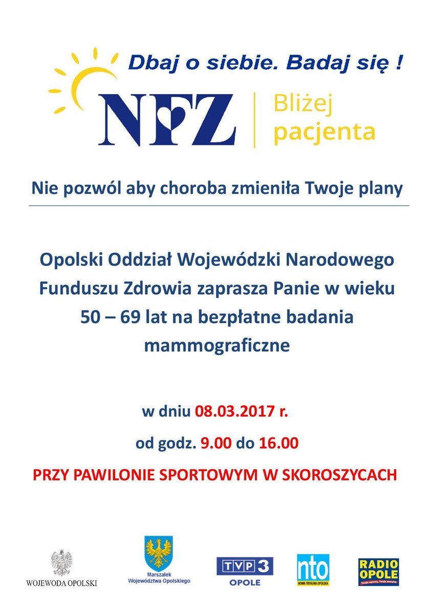 Badania odbędą się w dniu 08.03.2017 r. przy Pawilonie Sportowym w Skoroszycach. Celem kampanii jest dotarcie do jak największej grupy kobiet, które dotąd z różnych względów nie skorzystały z badań realizowanych w ramach bezpłatnych programów zdrowotnych Narodowego Fundusz Zdrowia. Kampania upływać będzie pod hasłem: