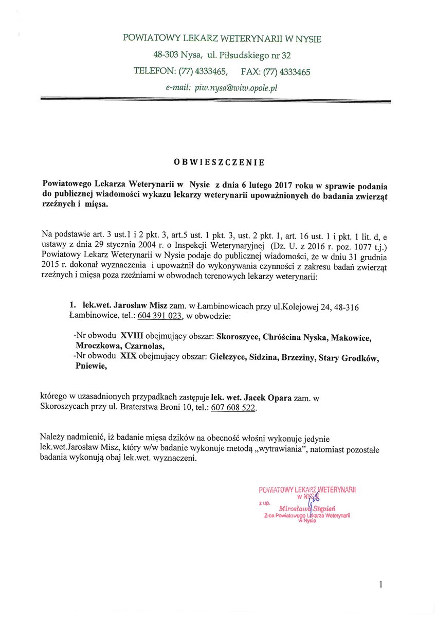 Powiatowy Lekarz Weterynarii w Nysie informuję, że zgodnie z Ustawą z dnia 29 stycznia 2004r. o Inspekcji Weterynaryjnej (Dz. U. z 2010 r. Nr 112 poz.744 z późn. zm.) ustalił obwody terenowe i rzeźniane badania zwierząt rzeźnych i mięsa oraz wyznaczył lekarzy weterynarii wykonujących w nich badania na terenie gmin powiatu nyskiego.