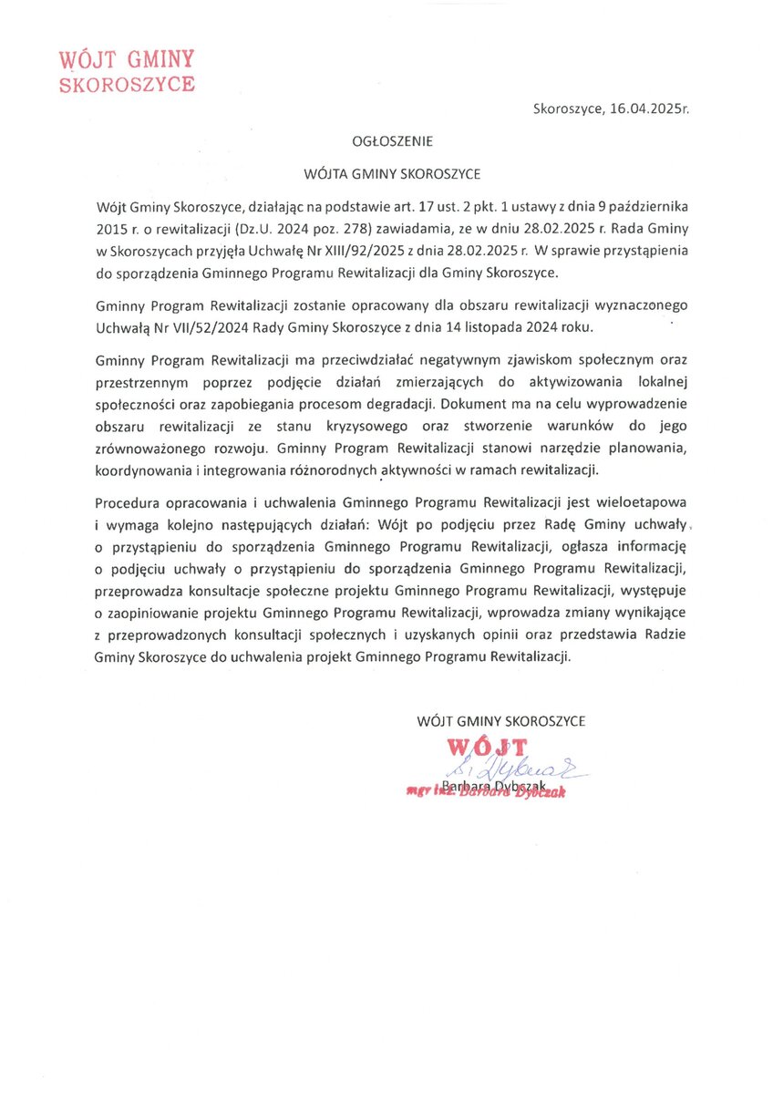 OGŁOSZENIE WÓJTA GMINY SKOROSZYCE