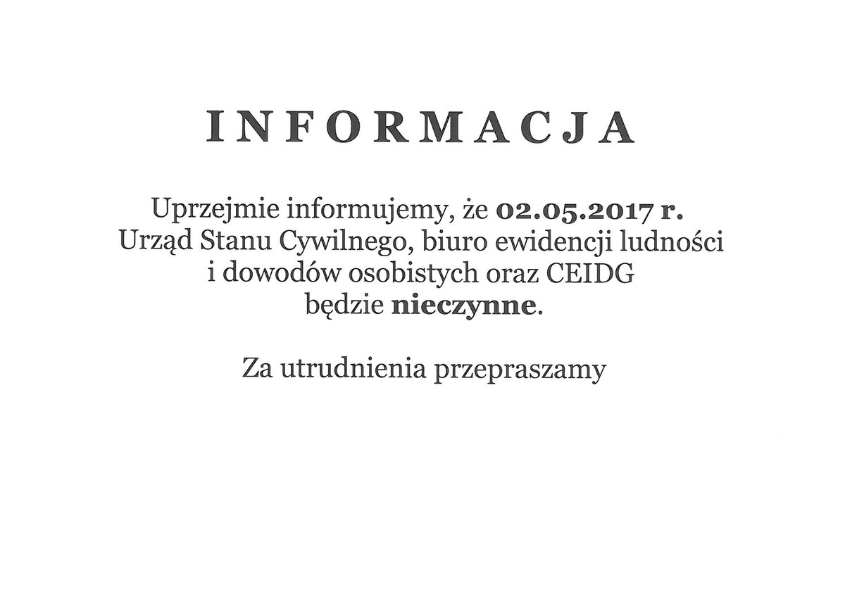 O2.05.2017 r. Urząd Stanu Cywilnego, biuro ewidencji ludności i dowodów osobistych oraz CEIDG będzie nieczynne