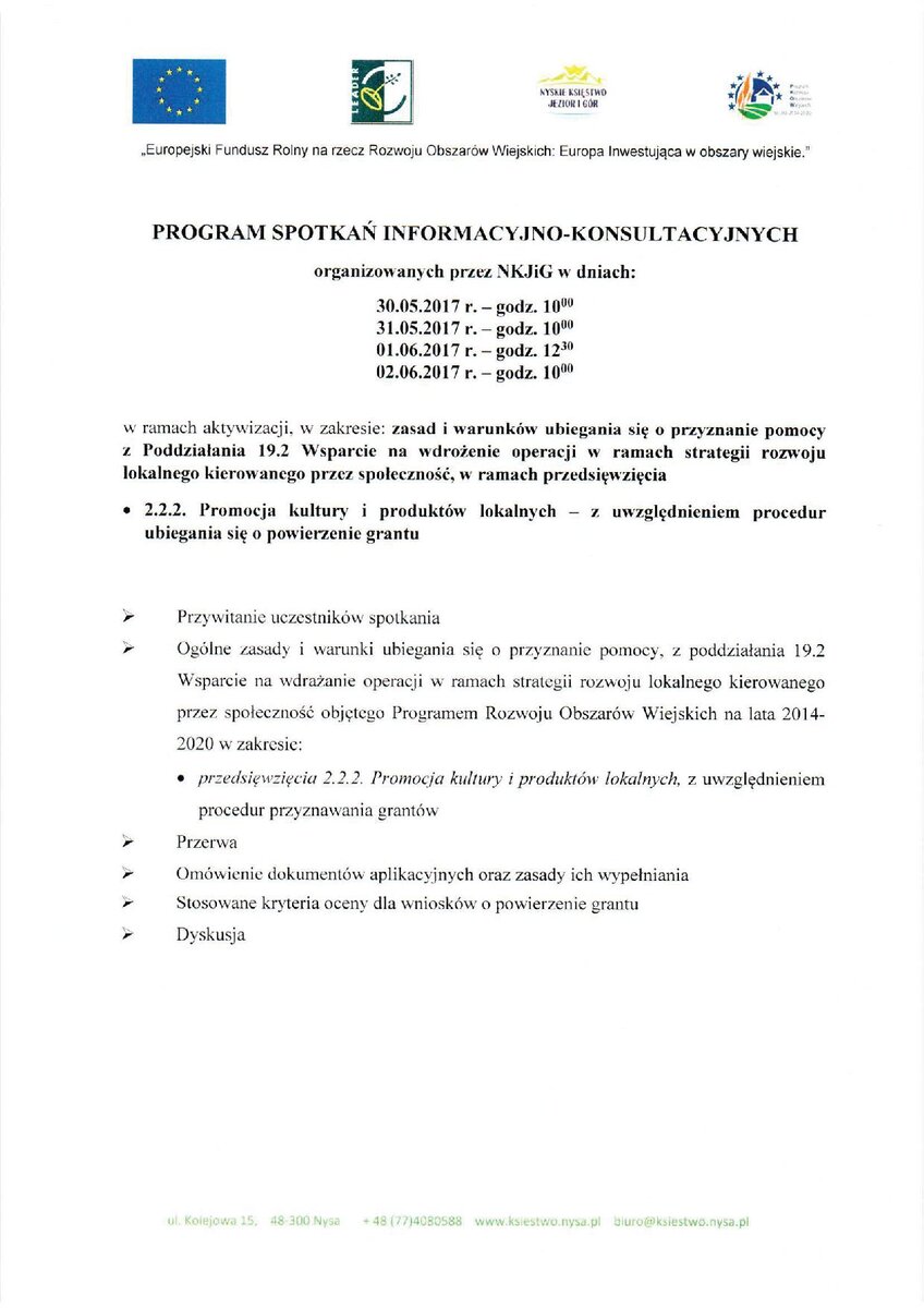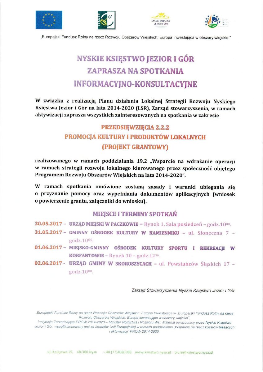 W związku z realizacją Planu działania Lokalnej Strategii Rozwoju Nyskiego Księstwa Jezior i Gór na lata 2014-2020 (LSR), Zarząd stowarzyszenia, w ramach aktywizacji zaprasza wszystkich zainteresowanych na spotkania.