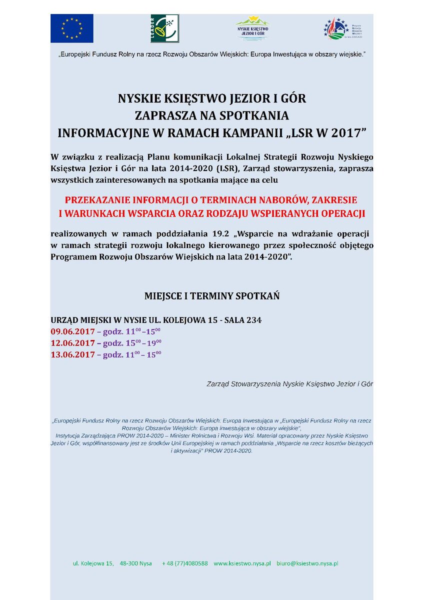 Zarząd Nyskiego Księstwa Jezior i Gór, w związku z realizacją Lokalnej Strategii Rozwoju Nyskiego Księstwa Jezior i Gór w zakresie realizacji Planu komunikacji informuje, o planowanych spotkaniach organizowanych w ramach kampanii Informacyjnej „LSR w 2017”.