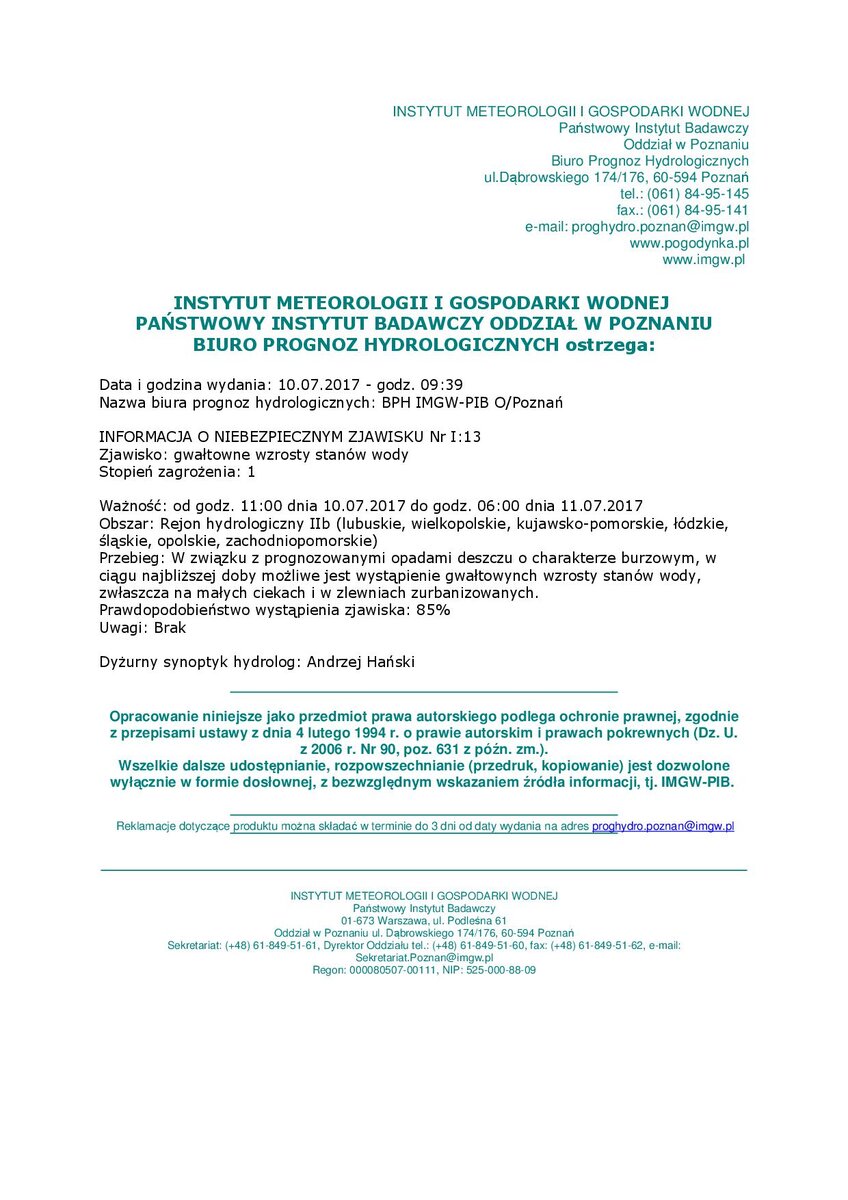 INSTYTUT METEOROLOGII I GOSPODARKI WODNEJ PAŃSTWOWY INSTYTUT BADAWCZY ODDZIAŁ W POZNANIU BIURO PROGNOZ HYDROLOGICZNYCH ostrzega