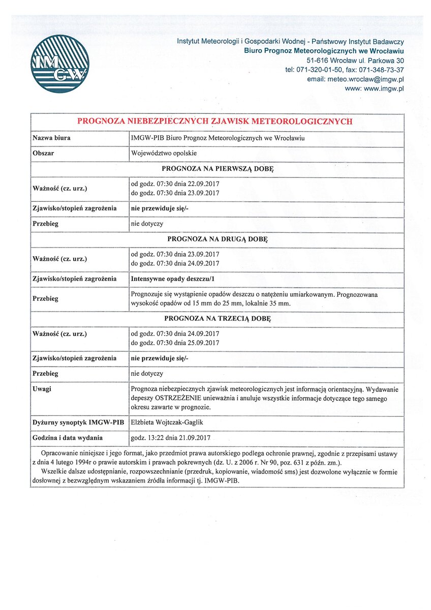 Prognozuje się wystąpienie opadów deszczu o natężeniu umierkowanym. Prognozowana wysokość opadów od 15 mm do 25 mm, lokalnie 35 mm.