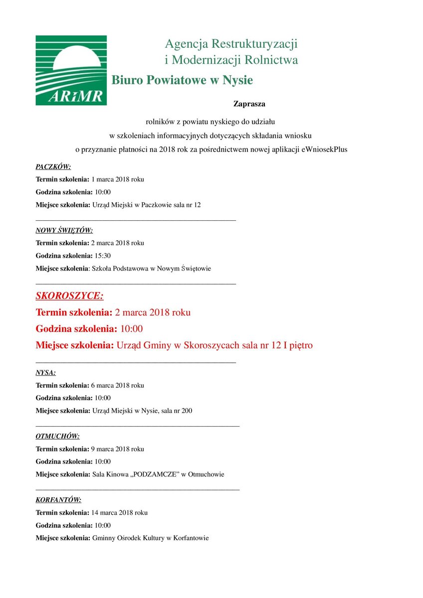 Serdecznie zapraszamy rolników z powiatu nyskiego do udziału w szkoleniach informacyjnych dotyczących składania wniosku o przyznanie płatności na 2018 rok za pośrednictwem nowej aplikacji eWniosekPlus