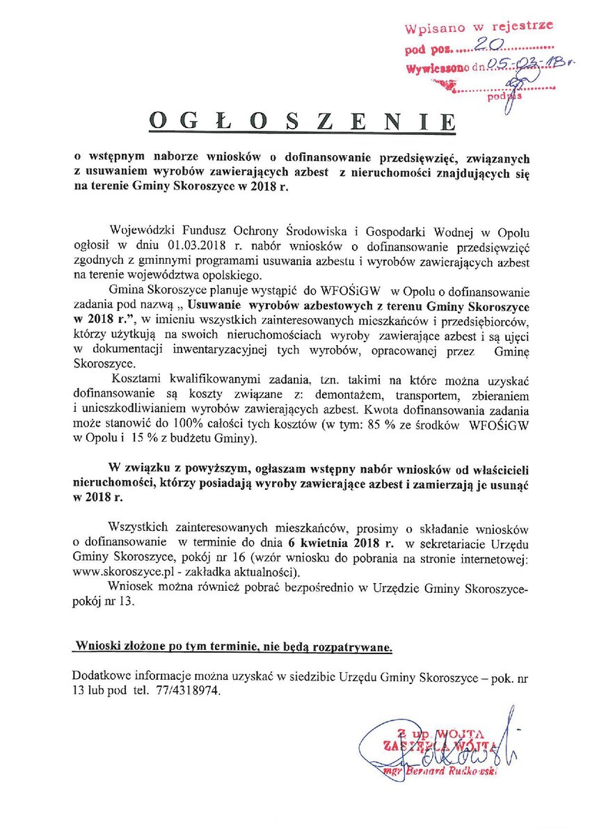 OGŁOSZENIE o wstępnym naborze wniosków o dofinansowanie przedsięwzięć związanych z usuwaniem wyrobów zawierających azbest z nieruchomości znajdujących sie na terenie Gminy Skoroszyce w 2018 r.