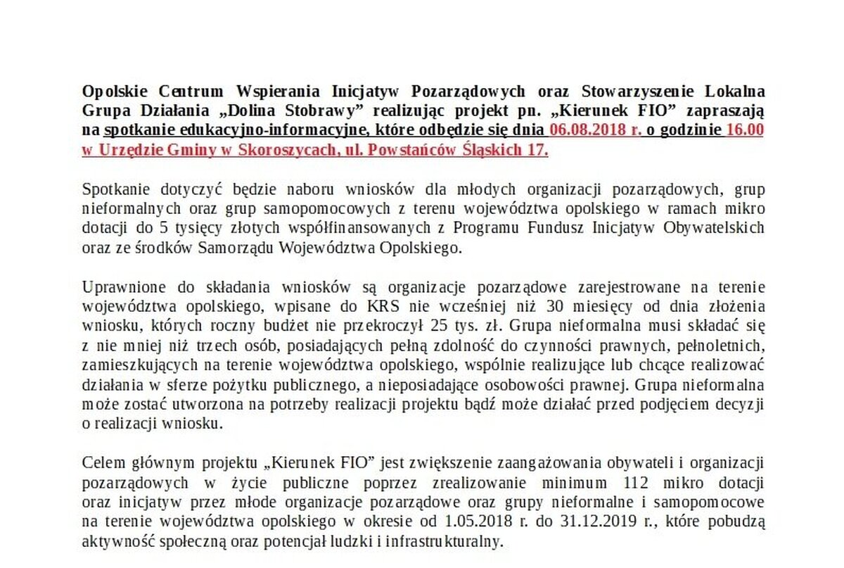Opolskie Centrum Wspierania Inicjatyw Pozarządowych oraz Stowarzyszenie Lokalna Grupa Działania „Dolina Stobrawy” realizując projekt pn. „Kierunek FIO” zapraszają na spotkanie edukacyjno-informacyjne, które odbędzie się dnia 06.08.2018 r. o godzinie 16.00 w Urzędzie Gminy w Skoroszycach, ul.Powstańców Śląskich 17.