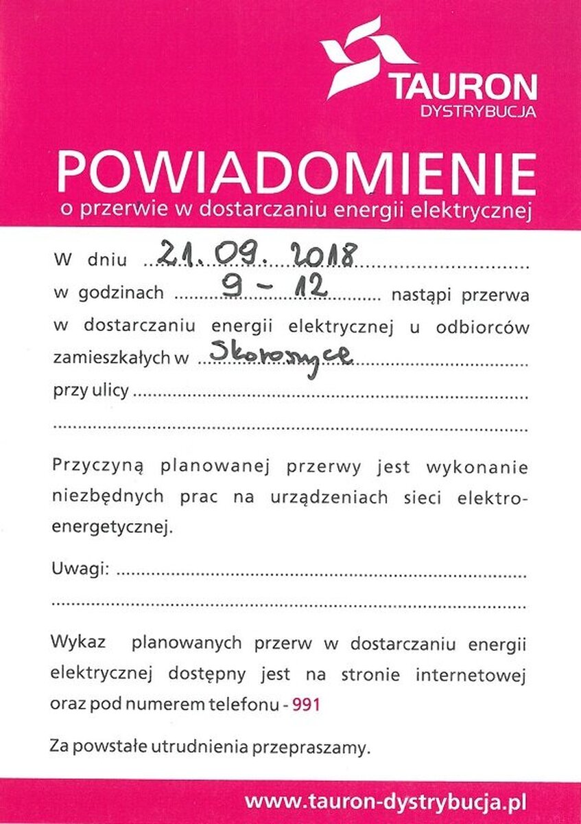 Przerwa w dostawie prądu w m. Skoroszyce!