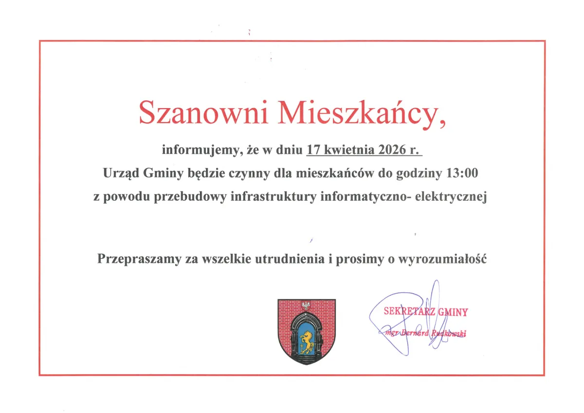 Komunikat w sprawie pracy Urzędu Gminy w dniu 17 kwiatnia 2026 r.