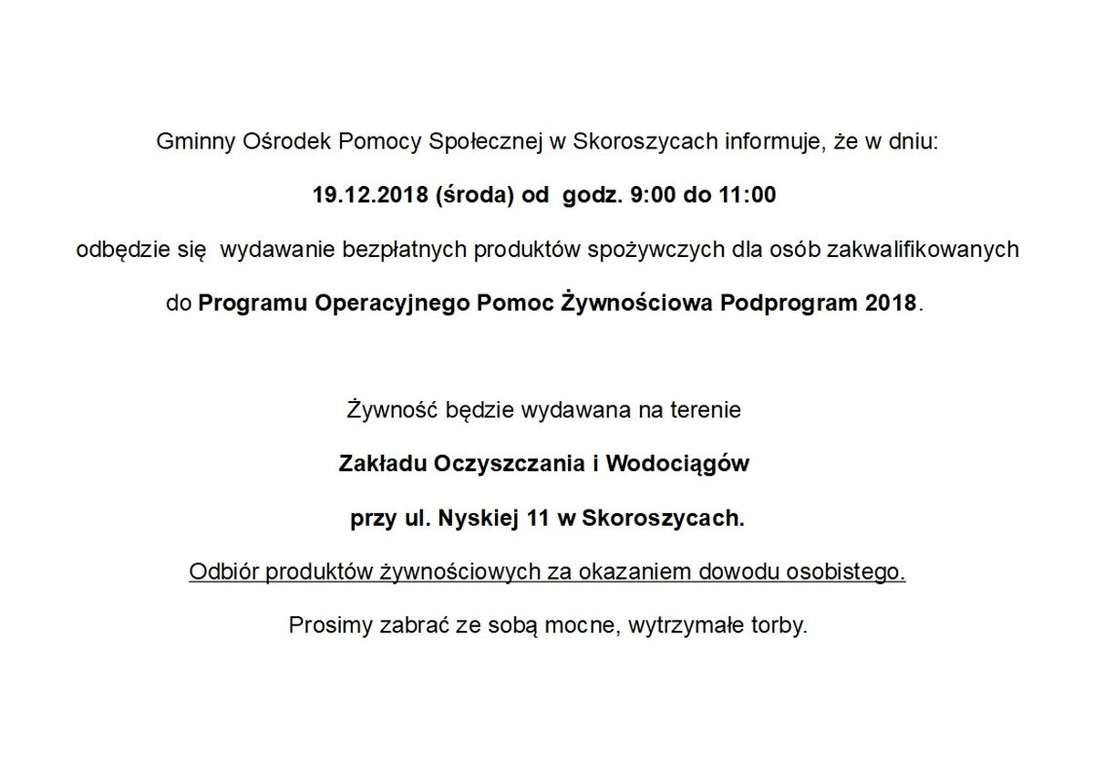 Wydawanie żywności w ramach Programu Operacyjnego Pomoc Żywnościowa 2014-2020 - Europejskiego Funduszu Pomocy Najbardziej Potrzebującym realizowanego w Podprogramie 2018.