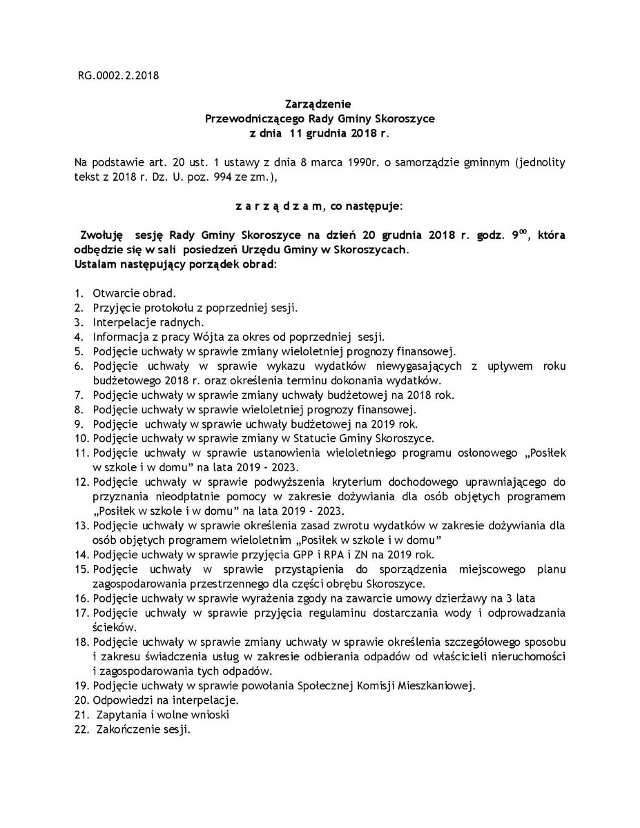 Zawiadamiamy mieszkańców Gminy Skoroszyce, że w dniu 20 grudnia 2018 r. o godz. 9:00 w sali posiedzeń Urzędu Gminy w Skoroszycach odbędzie się sesja Rady Gminy Skoroszyce.