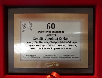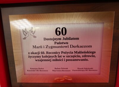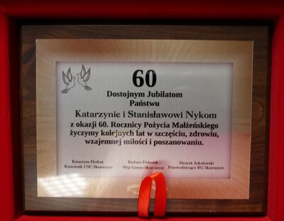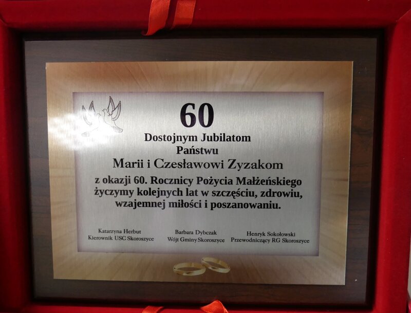 W dniu 24 stycznia 2019 r. na Sali Posiedzeń Urzędu Gminy w Skoroszycach odbyła się uroczystości 60. Pożycia Małżeńskiego. W uroczystości wzięli udział Wójt Gminy Pani Barbara Dybczak, Zastępca Wójta Gminy Pan Bernard Rudkowski, Przewodniczący Rady Gminy Pan Henryk Sokołowski, Kierownik USC Pani Katarzyna Herbut oraz Drodzy Jubilaci wraz z Najbliższymi. Byli to Państwo: