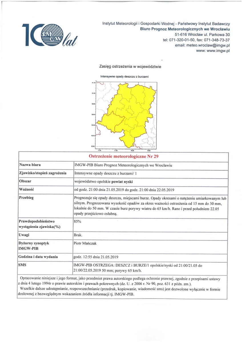 IMGW-PIB Biuro Prognoz Meteorologicznych we Wrocławiu ostrzega o możliwości wystąpienia intensywnych opadów deszczu z burzami.