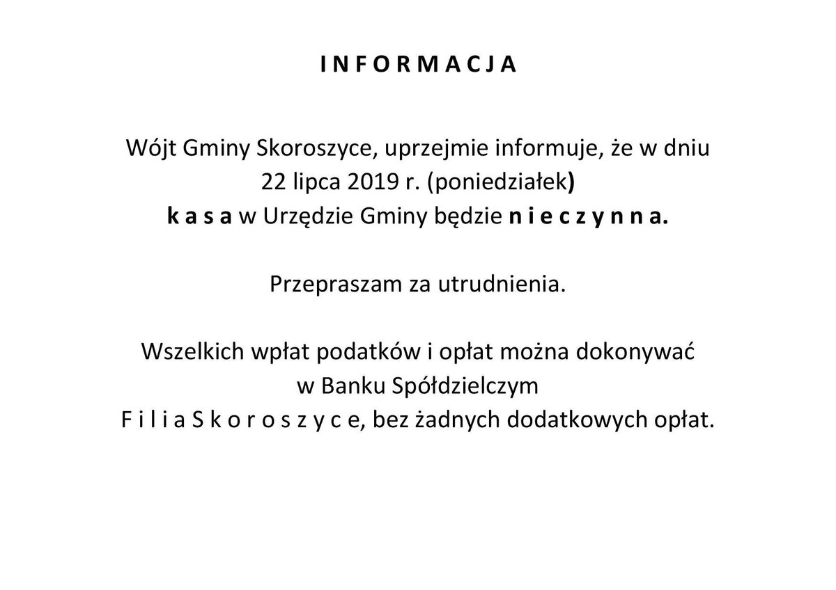 Wójt Gminy Skoroszyce, uprzejmie informuje, że w dniu 22 lipca 2019 r.(poniedziałek) k a s a w Urzędzie Gminy będzie n i e c z y n n a.
