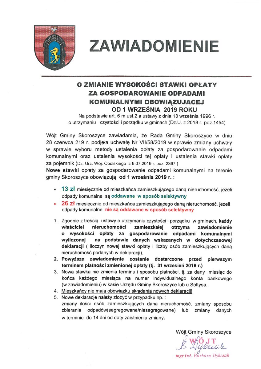 ZMIANA WYSOKOŚCI STAWKI OPŁATY ZA GOSPODAROWANIE ODPADAMI