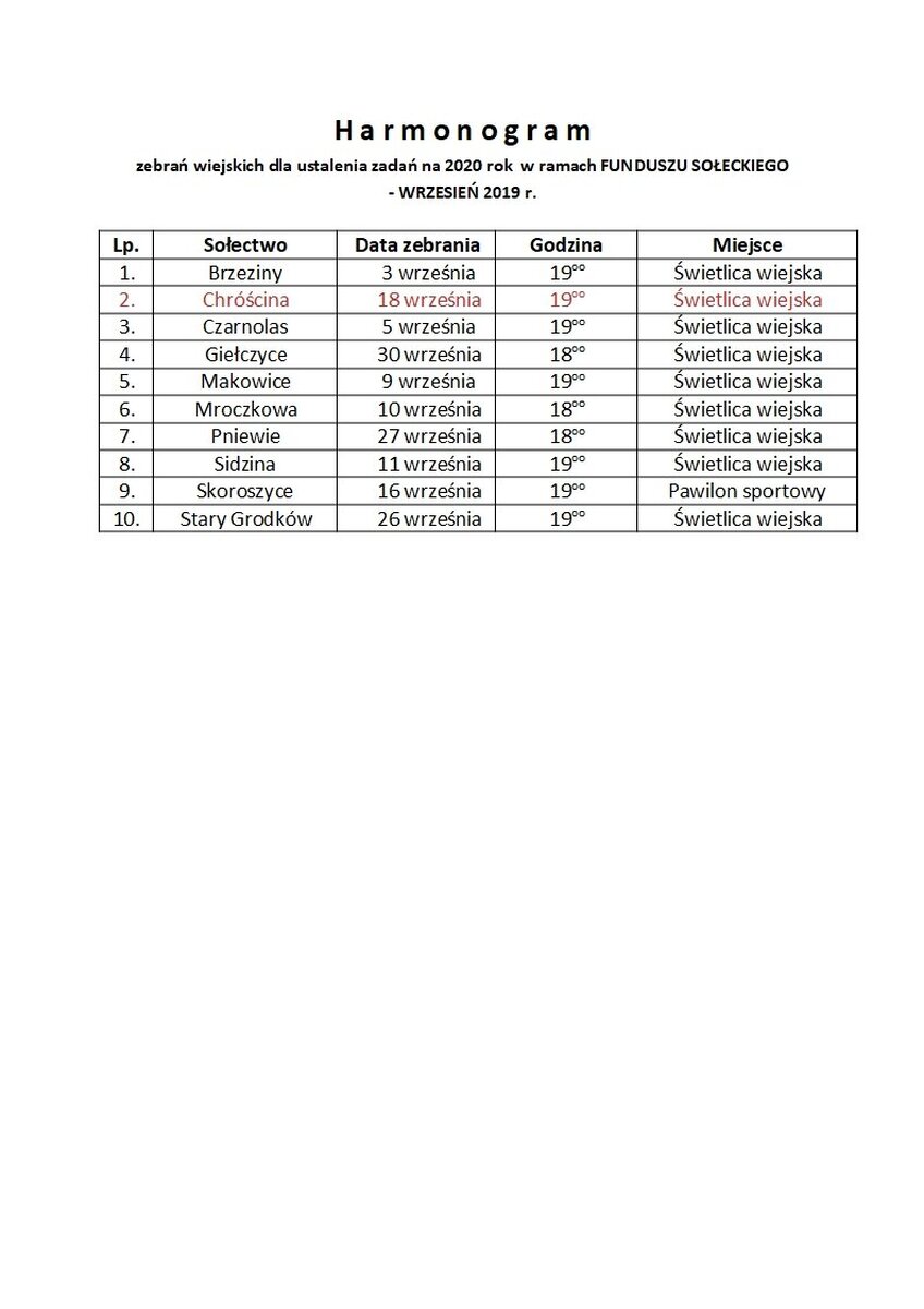 W związku z wyborem sołtysa zmianie ulega termin i porządek zebrania wiejskiego z 4 września (środa) 2019 r. na 18 września (środa) 2019 r.