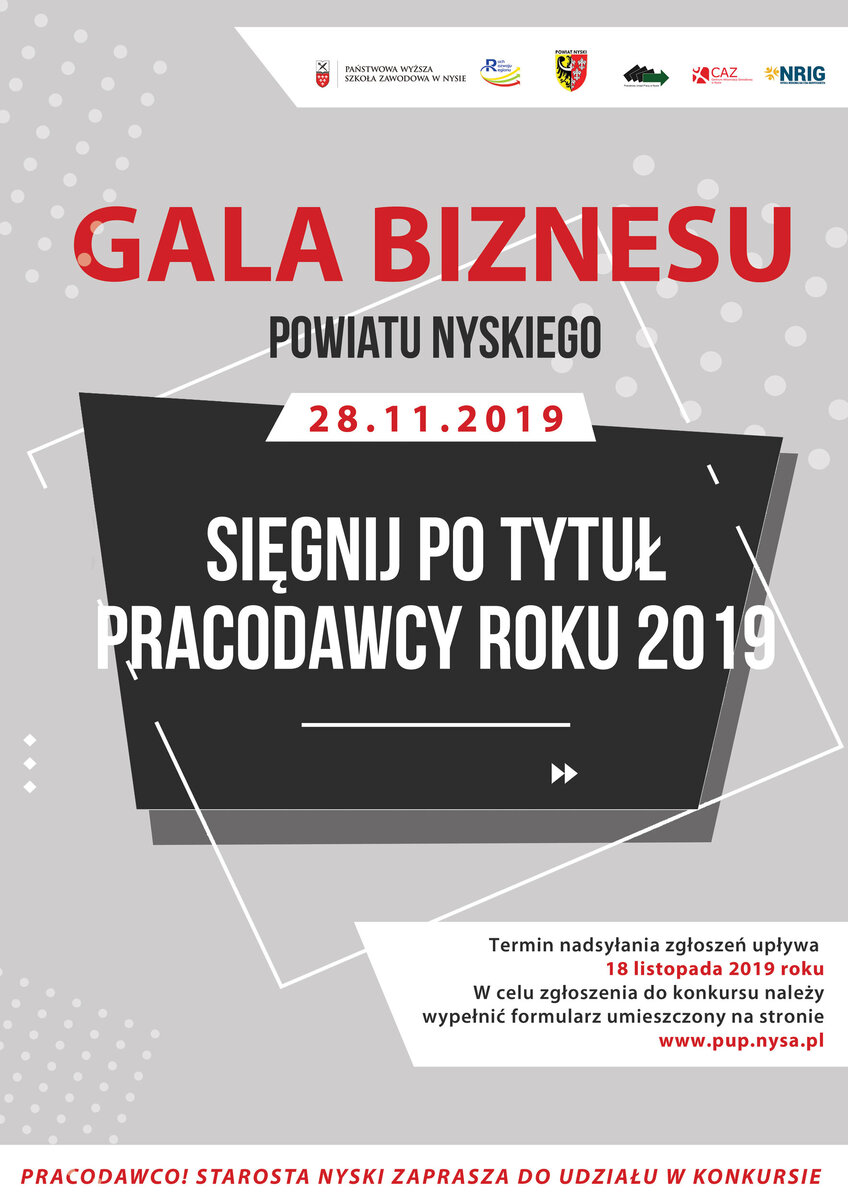 Starosta Nyski, Nyska Regionalna Izba Gospodarcza, Ruch Rozwoju Regionu oraz Państwowa Wyższa Szkoła Zawodowa w Nysie mają zaszczyt zaprosić Państwa do udziału w XI Edycji konkursu „Pracodawca Roku 2019 Powiatu Nyskiego”.