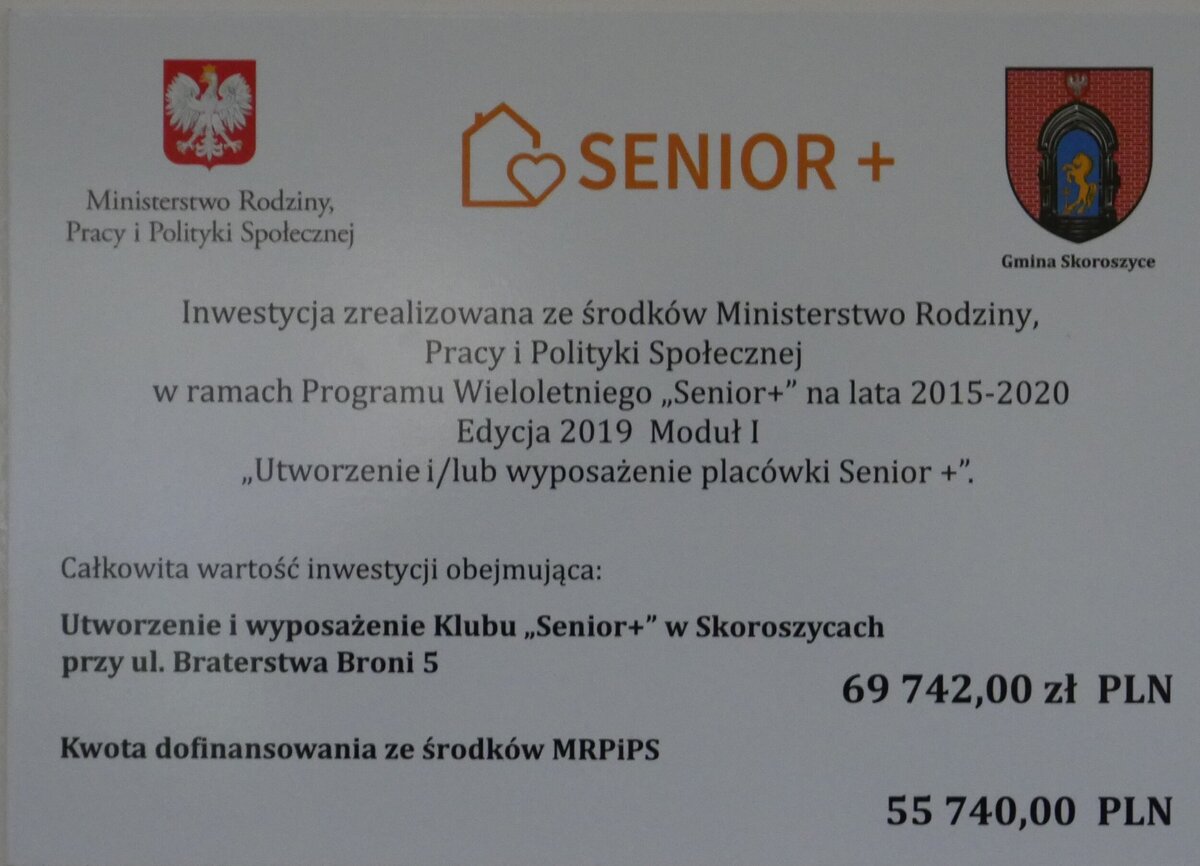 Dn. 27 listopada 2019 r. nastąpiło w Skoroszycach oficjalne otwarcie Klubu Seniora+. Ze środków Ministerstwa Rodziny, Pracy i Polityki Społecznej oraz budżetu Gm. Skoroszyce poddano remontowi 2 pomieszczenia w Pawilonie Sportowym, adaptując je na potrzeby Seniorów. Jest świetlica i kuchnia wyposażona w sprzęt AGD. Z ramienia Wojewody Opolskiego w uroczystości wzięła udział Z-ca Dyrektora Wydziału Polityki Społecznej i Zdrowia P. Beata Jabłońska. Skoroszyccy Seniorzy podjęli gości z Dąbrowy, z którymi nawiązali nić sympatii. Stąd bliskie relacje Klubów Seniora z Dąbrowy i Skoroszyc. Ciepła, złota jesień 2019 r. niech sprzyja złotej jesieni życia!