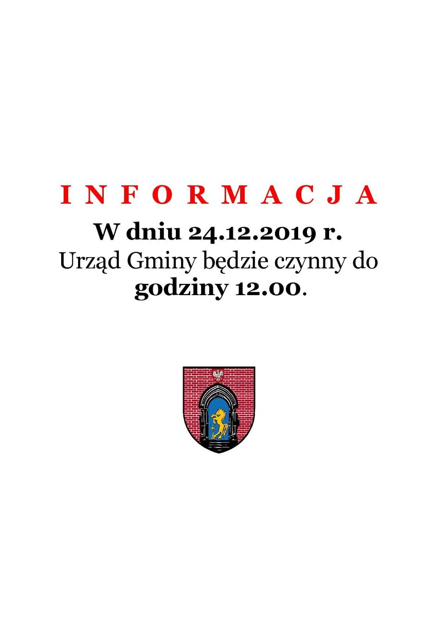 W dniu 24.12.2019 r. Urząd Gminy będzie czynny do godziny 12.00.