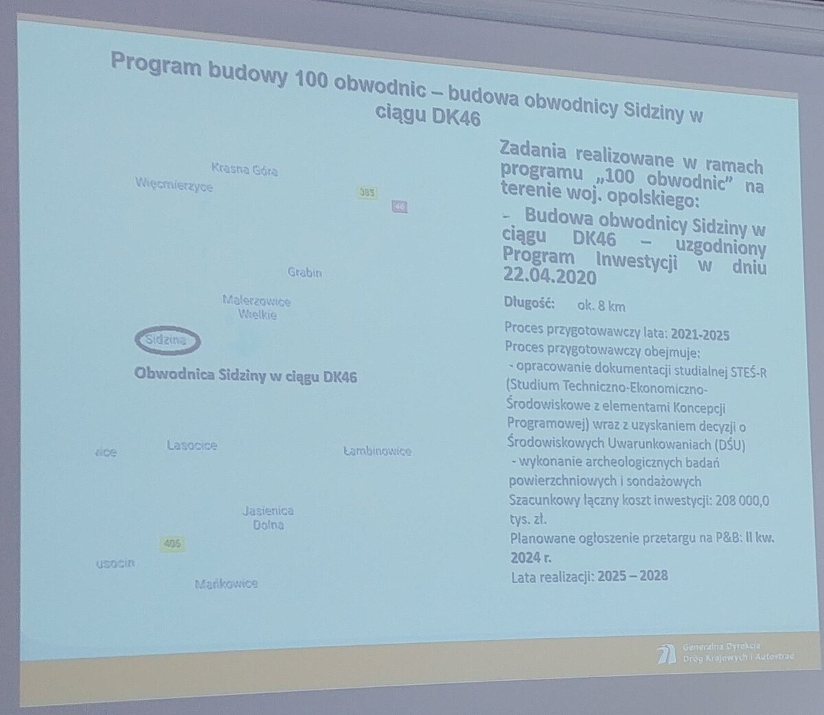 W dniu 11 sierpnia 2020 r. z udziałem Pana Bernarda Rudkowskiego Zastępcy Wójta Gminy Skoroszyce w siedzibie Generalna Dyrekcja Dróg Krajowych i Autostrad Oddział w Opolu odbyło się 1. spotkanie poświęcone harmonogramowi budowy obwodnic na terenie woj. opolskiego. W ramach zadania powstanie obwodnica Sidziny w ciągu drogi krajowej DK 46 o długości prawie 8 km. Jednym z elementów obwodnicy będzie powstanie nowego mostu na rzece Nysie Kłodzkiej. Szacunkowa wartość zadania to prawie 208 mln zł. Na realizację zadania Generalna Dyrekcja ma podpisane zapewnienie finansowania.