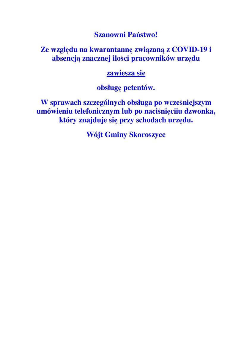 Ze względu na kwarantannę związaną z COVID-19 i absencją znacznej ilości pracowników urzędu