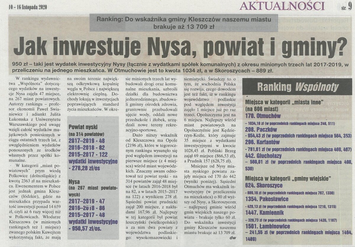 Gmina Skoroszyce na 4 miejscu w Powiecie Nyskim pod względem wysokości wydatków inwestycyjnych w przeliczeniu na 1 mieszkańca, w dodatku z minimalnym długiem na poziomie 1,78%. Daje nam to 624 miejsce w Polsce. W poprzednich latach były to odpowiednio miejsca 767 i 1330. O 61,38 zł wyprzedza nas Nysa i 65,24 zł Paczków i 144,99 Otmuchów.