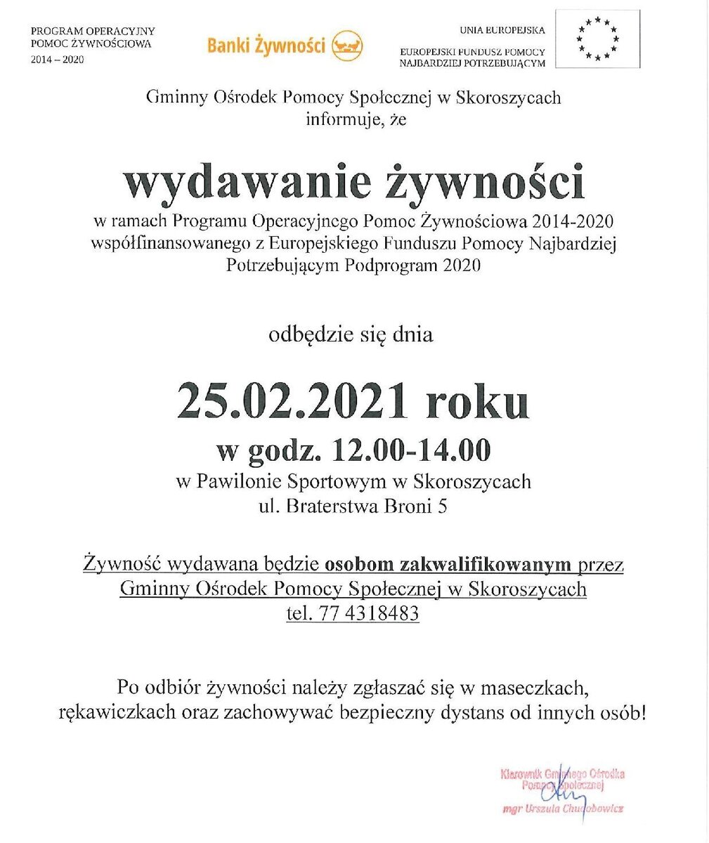 Żywność wydawana będzie osobom zakwalifikowanym przez Gminny Ośrodek Pomocy Społecznej w Skoroszycach