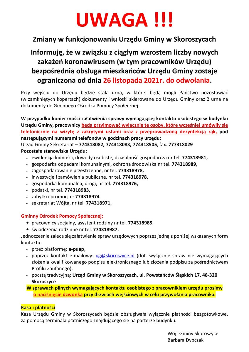 Informuję, że w związku z ciągłym wzrostem liczby nowych zakażeń koronawirusem (w tym pracowników Urzędu) bezpośrednia obsługa mieszkańców Urzędu Gminy zostaje ograniczona od dnia 26 listopada 2021r. do odwołania.