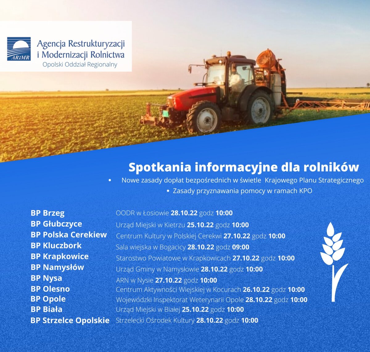 Agencja Restrukturyzacji i Modernizacji Rolnictwa uprzejmie informujemy o cyklu spotkań dedykowanych rolnikom jakie odbędą się na terenie województwa opolskiego w związku z wejściem Nowego Planu Strategicznego dla rolników oraz uruchomieniem pierwszych naborów w ramach Krajowego Planu Odbudowy.