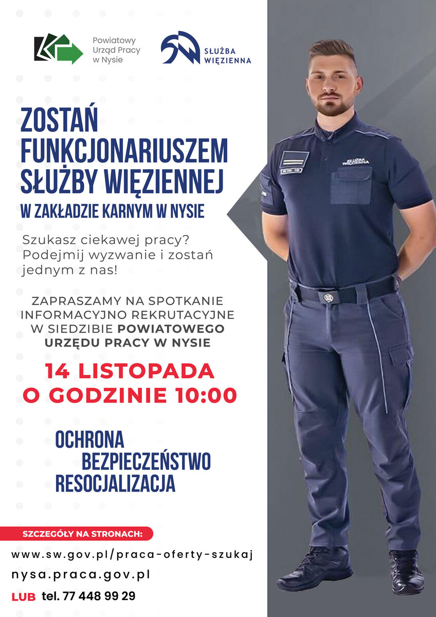 Powiatowy Urząd Pracy w Nysie zaprasza osoby chętne do pracy w Zakładzie Karnym w Nysie na spotkanie informacyjno-rekrutacyjne z przedstawicielami Służby Więziennej, które odbędzie się dnia 14 listopada o godzinie 10.00 w siedzibie naszego urzędu.
