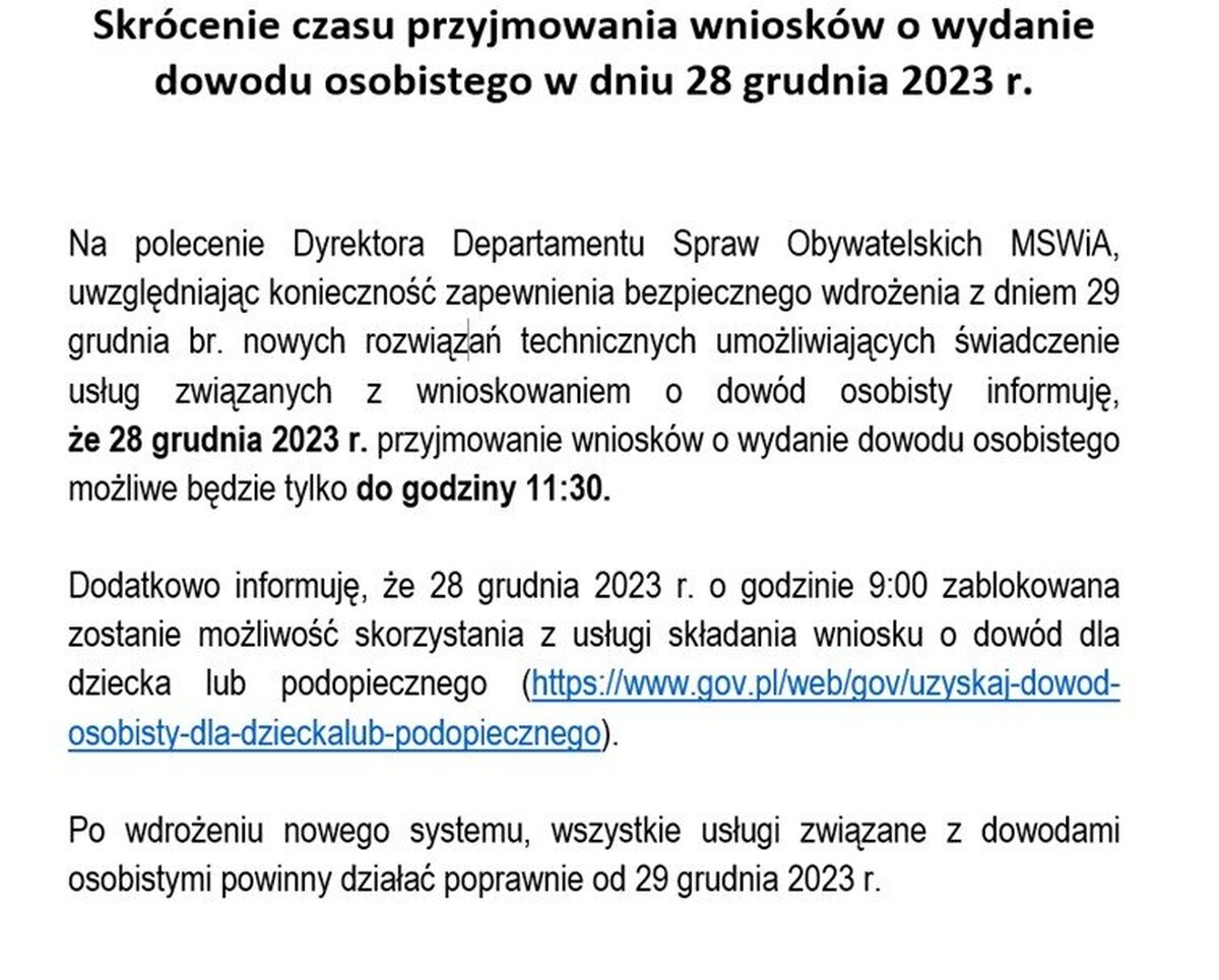 W czwartek 28 grudnia 2023 r. wnioski o wydanie dowodu osobistego będą przyjmowane tylko do godziny 11:30. Powyższe utrudnienia wynikają z konieczności wdrożenia w całym kraju nowych rozwiązań technicznych związanych z wnioskowaniem o dowód osobisty.