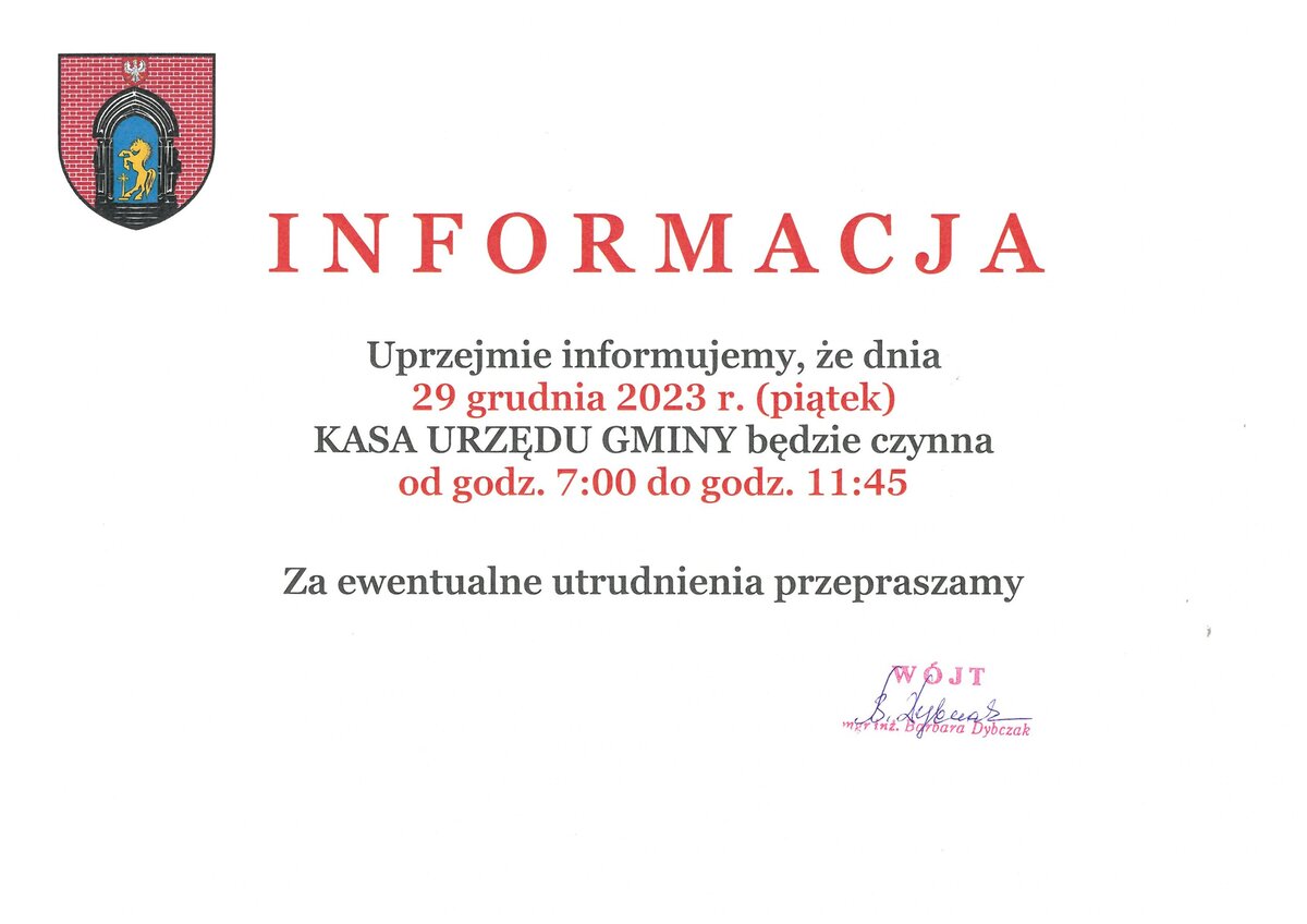 29 grudnia 2023 r. KASA Urzędu Gminy będzie czynna do 11:45