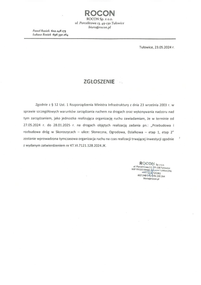 w załączeniu przekazujemy projekt tymczasowej organizacji ruchu, która obowiązywać będzie w terminie 27.05.2024 r. do 28.01.2025 r. na drogach objętych realizacją zadania: „Przebudowa i rozbudowa dróg w Skoroszycach – ulice: Słoneczna, Ogrodowa, Działkowa – Etap 1, Etap 2” na czas realizacji trwającej inwestycji.