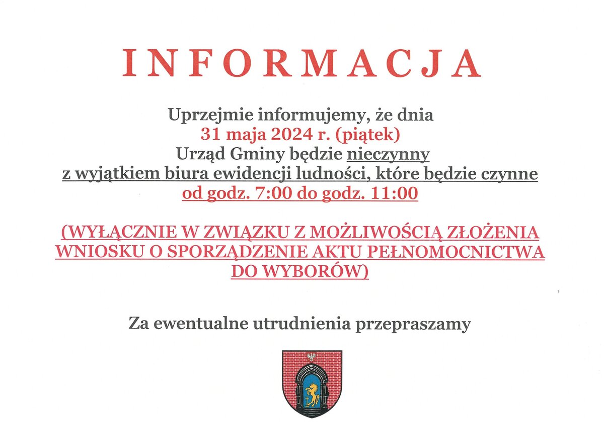 Informujemy, że 31 maja 2024 r. (piątek) Urząd Gminy będzie nieczynny.