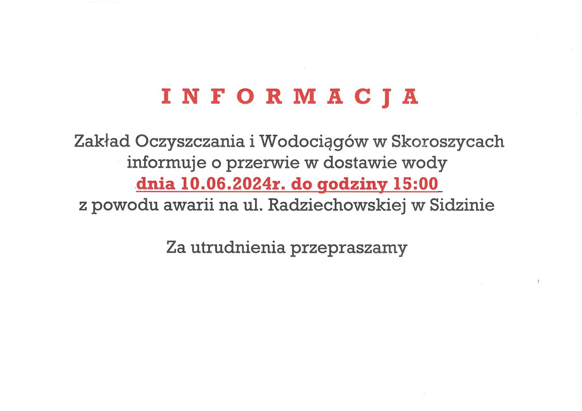 Zakład Oczyszczania i Wodociągów w Skoroszycach informuje o przerwie w dostawie wody dnia 10.06.2024r. do godziny 15:00 z powodu awarii na ul. Radziechowskiej w Sidzinie