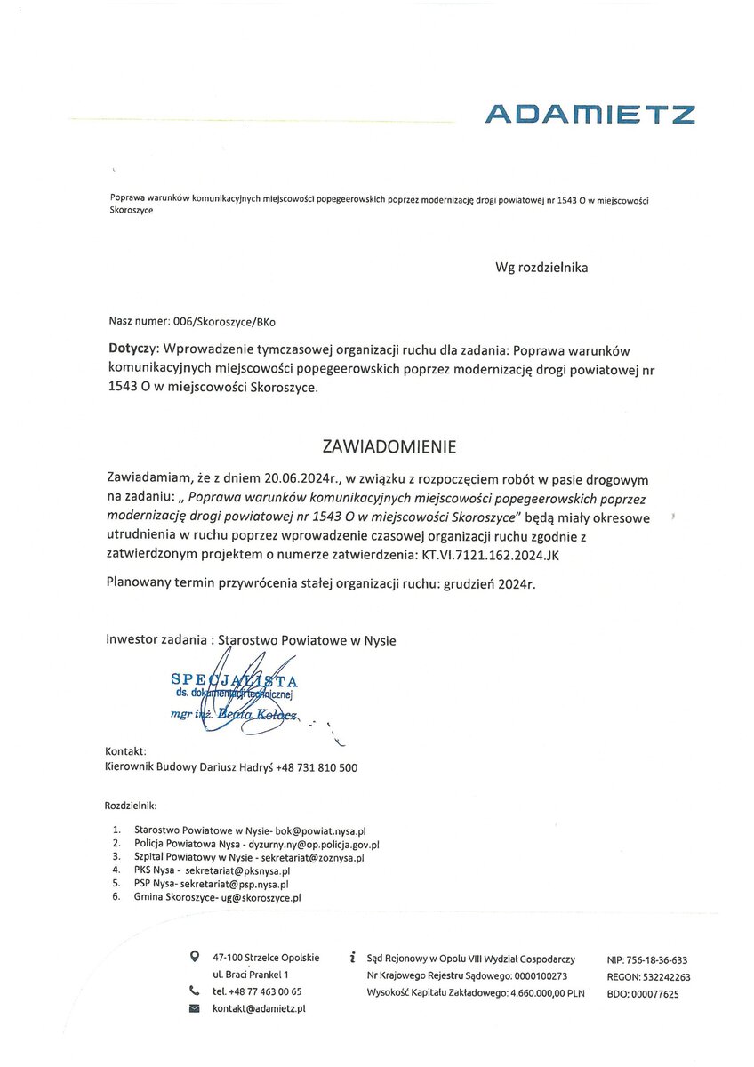 Skoroszyce” zawiadamiamy o utrudnieniach w ruchu poprzez wprowadzenie czasowej organizacji ruchu zgodnie z zatwierdzonym projektem o numerze zatwierdzenia: KT.VI.7121.162.2024.JK