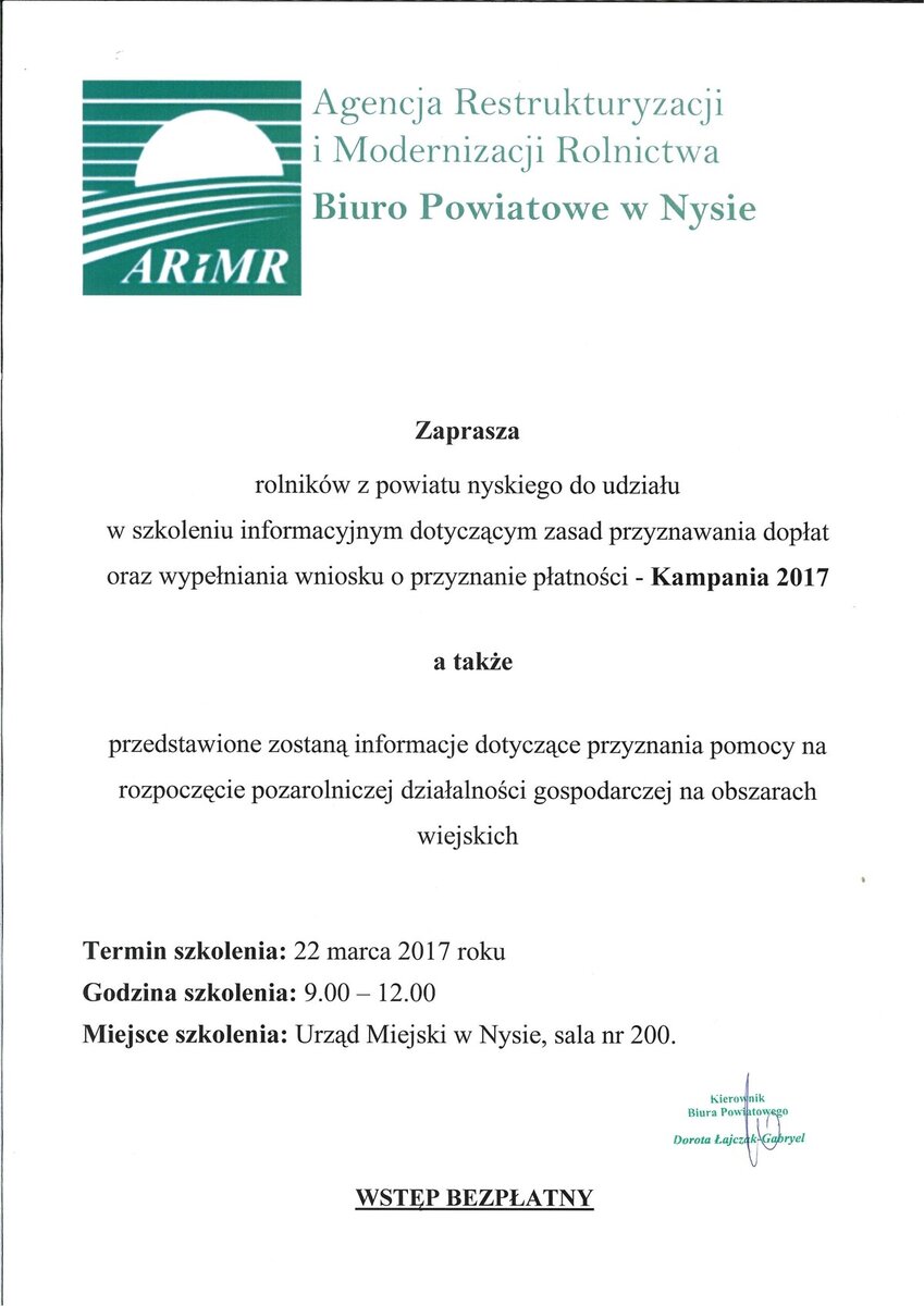 Kierownik Biura Powiatowego Agencji Restrukturyzacji i Modernizacji Rolnictwa w Nysie zaprasza na szkolenie informacyjne dla rolników z powiatu nyskiego, dotyczące zasad wypełniania wniosku o przyznanie płatności - Kampania 2017.