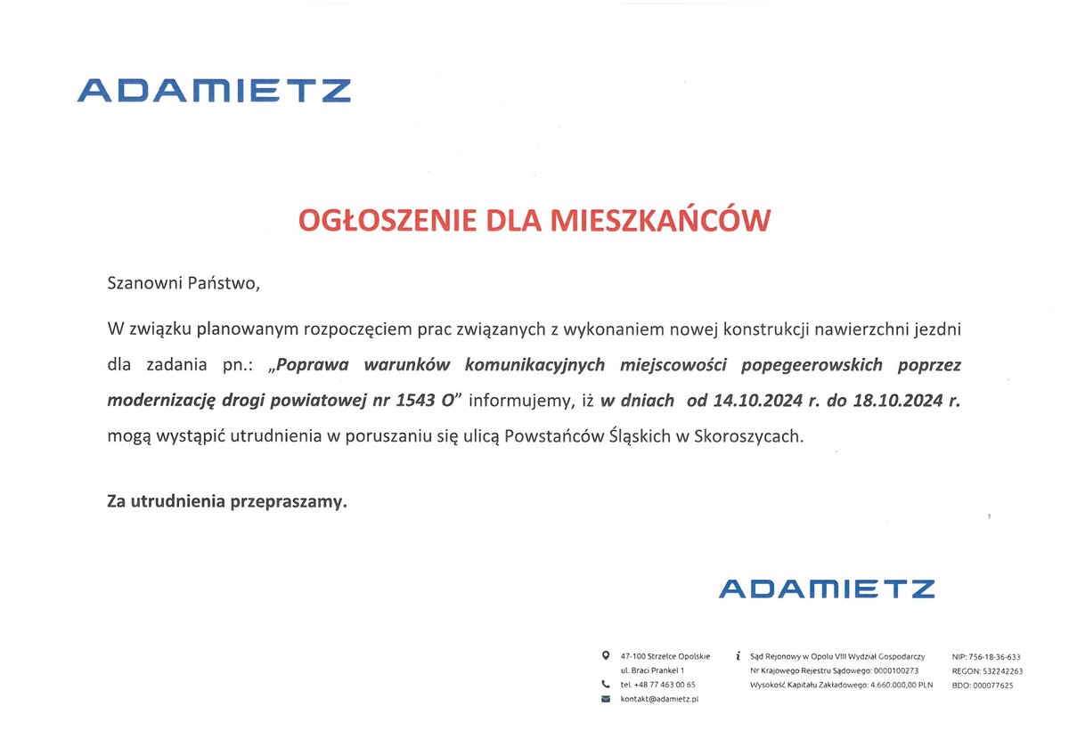 informujemy, iż w dniach od 14.10.2024 r. do 18.10.2024 r. mogą wystąpić utrudnienia w poruszaniu się ulicą Powstańców Śląskich w Skoroszycach.
