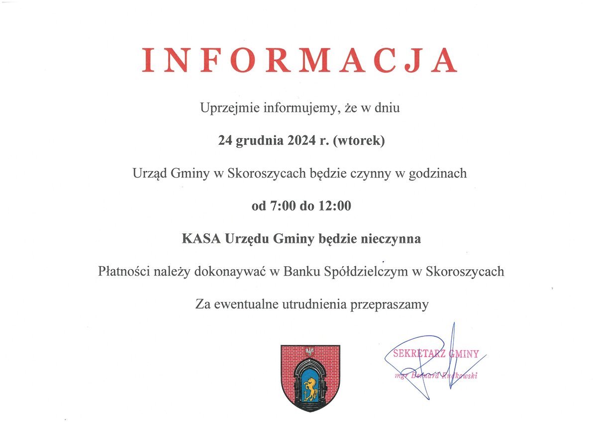 ŚWIĘTA - GODZINY PRACY URZĘDU