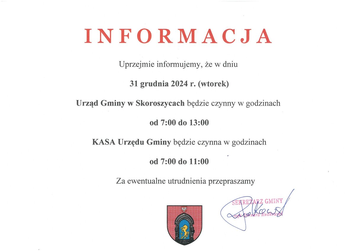 GODZINY PRACY URZĘDU 31 GRUDNIA 2024 r. -INFORMACJA