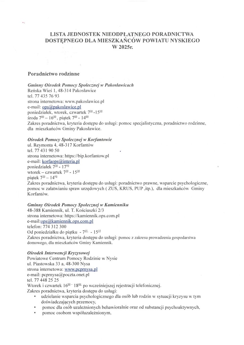 Lista jednostek nieodpłatnego poradnictwa dostępnego dla mieszkańców Powiatu Nyskiego w 2025r.
