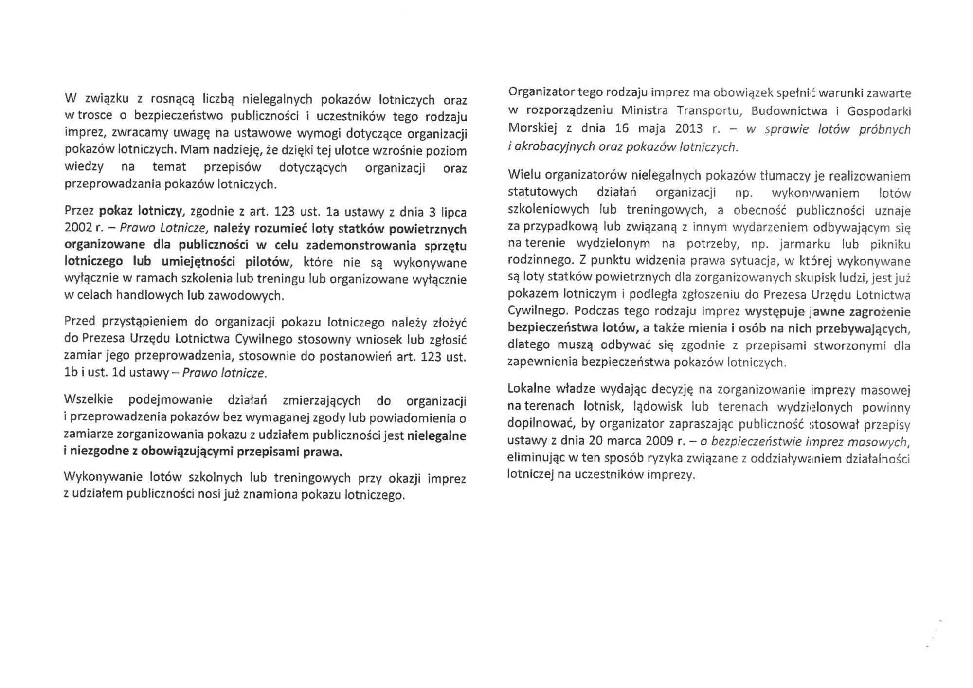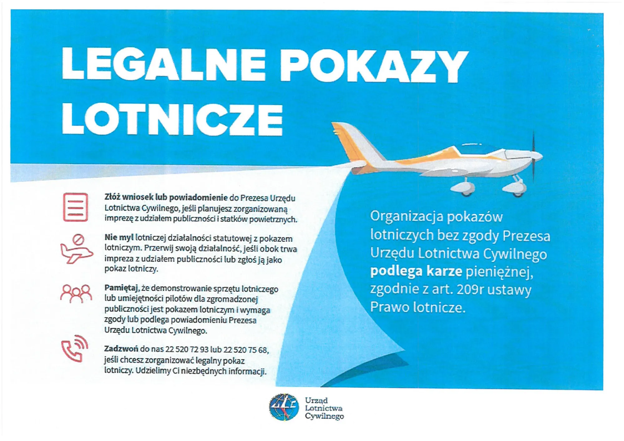 Urząd Lotnictwa Cywilnego przygotował ulotkę informacyjną dotyczącą zasad bezpieczeństwa podczas imprez masowych, a także organizacji lotów widokowych i zapoznawczych. Materiał przypomina o podstawowych obowiązkach organizatorów oraz wskazuje, jak dbać o komfort i bezpieczeństwo uczestników wydarzeń.