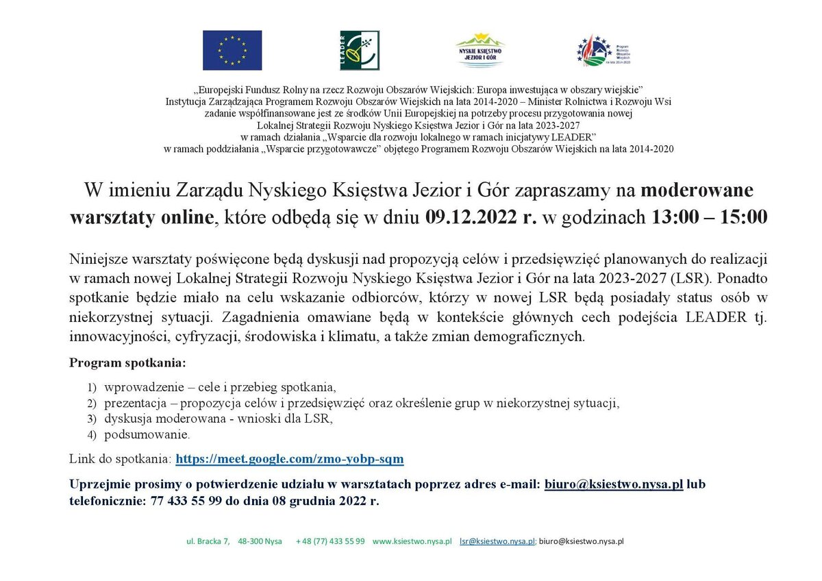W imieniu Zarządu Nyskiego Księstwa Jezior i Gór zapraszamy na moderowane warsztaty online, które odbędą się w dniu 09.12.2022 r. w godzinach 13:00 – 15:00